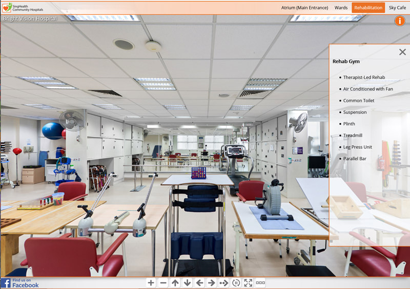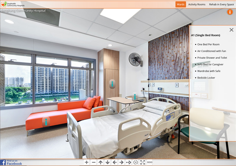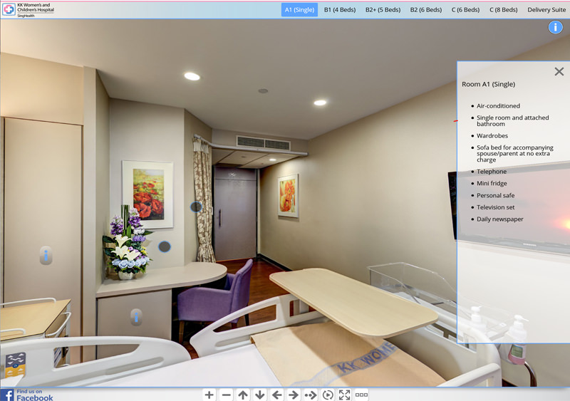 Since 2016 we have been involved in creating hospital virtual tours for SingHealth locations in Singapore.The project started with a virtual tour of KK Women’s and Children’s Hospital and developed the web interface. Since then we have photographed virtual tours for 8 other SingHealth locations including Bright Vision Hospital, National Dental Centre, National Heart Centre, National Neurological Institute, Singapore General Hospital, Sengkang Community Hospital, Sengkang General Hospital and the The original virtual tour interface has now been updated and custom coded. It includes a top navigation menu system with groups for each ward and a side description box which provides various information about the 360 photo. This can be opened or closed by the x within the description box or with the info button above it. There is a bottom navigation bar which allows the viewer to zoom in and out, turn left and right, stop the auto rotation of the tour or make the tour full screen. You can also find a “find us on facebook” link which will take you to to the Facebook page of the current hospital.